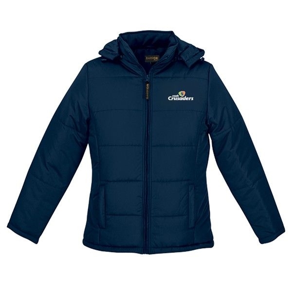 Shaped side panels for feminine fit. Bar-tacked side pockets. Double top-stitching on side panels. Quilted. Medium weight. Padded. Zip-off hood and hem with drawcord and toggle. 80g 100% Coated Polyester fabric. Water and wind resistant.